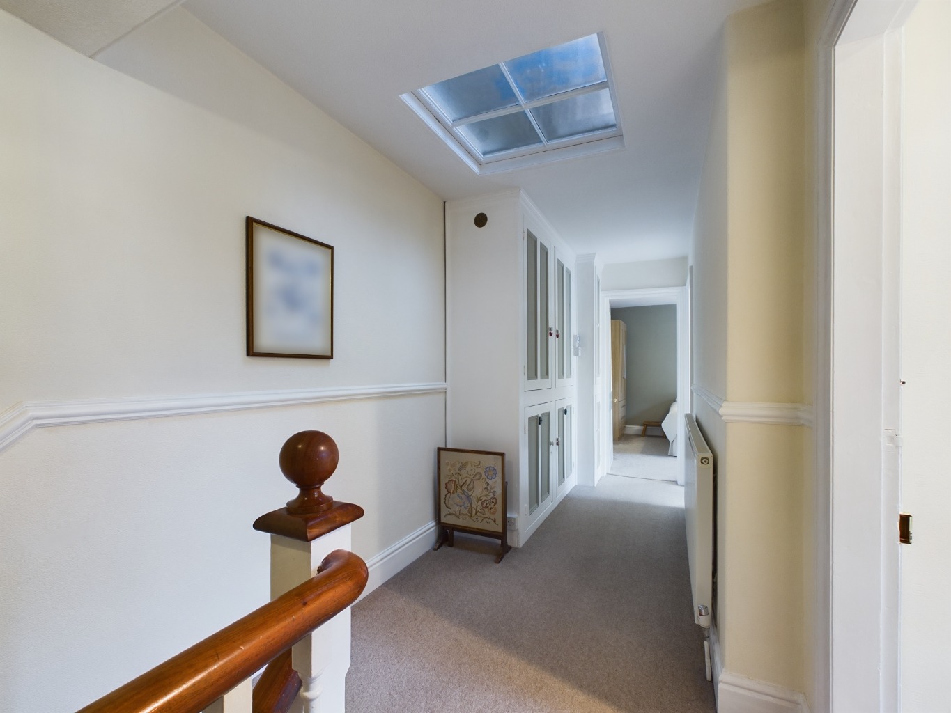 First Floor Landing - A generous, split-level landing with built-in storage, radiator and fitted carpet.