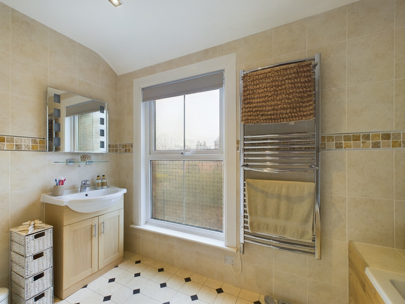 Bathroom - 3.12m x 1.98m (10'3" x 6'6") - A smartly appointed facility features a white suite comprising bath tub with shower over and a vanity wash basin with cabinet below. Attractive wall tiling, vinyl flooring, chrome column radiator with towel rail, plus electric towel radiator and a double glazed window.
