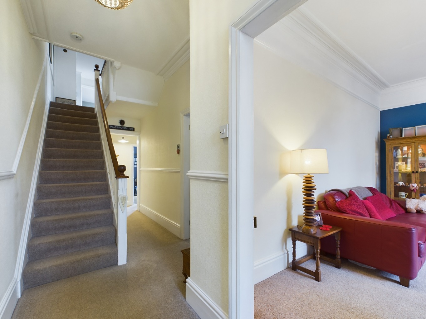 Entrance Hall - A modern composite entrance door, with double glazed panel detail, opens to a welcoming hallway with ornate ceiling coving, two radiators, built-in storage cupboard and fitted carpet. The staircase rises to the first floor, with additional storage cupboard below.