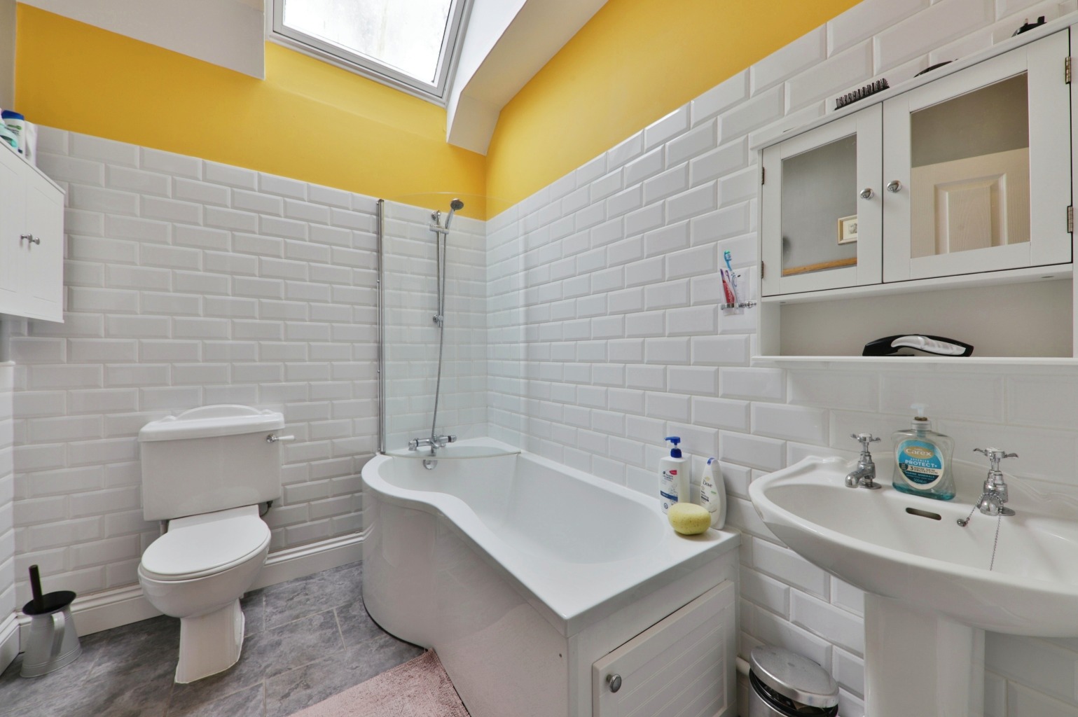 Half tiled complementing a three piece suite comprising panelled bath with shower over, pedestal wash hand basin and low level w.c.