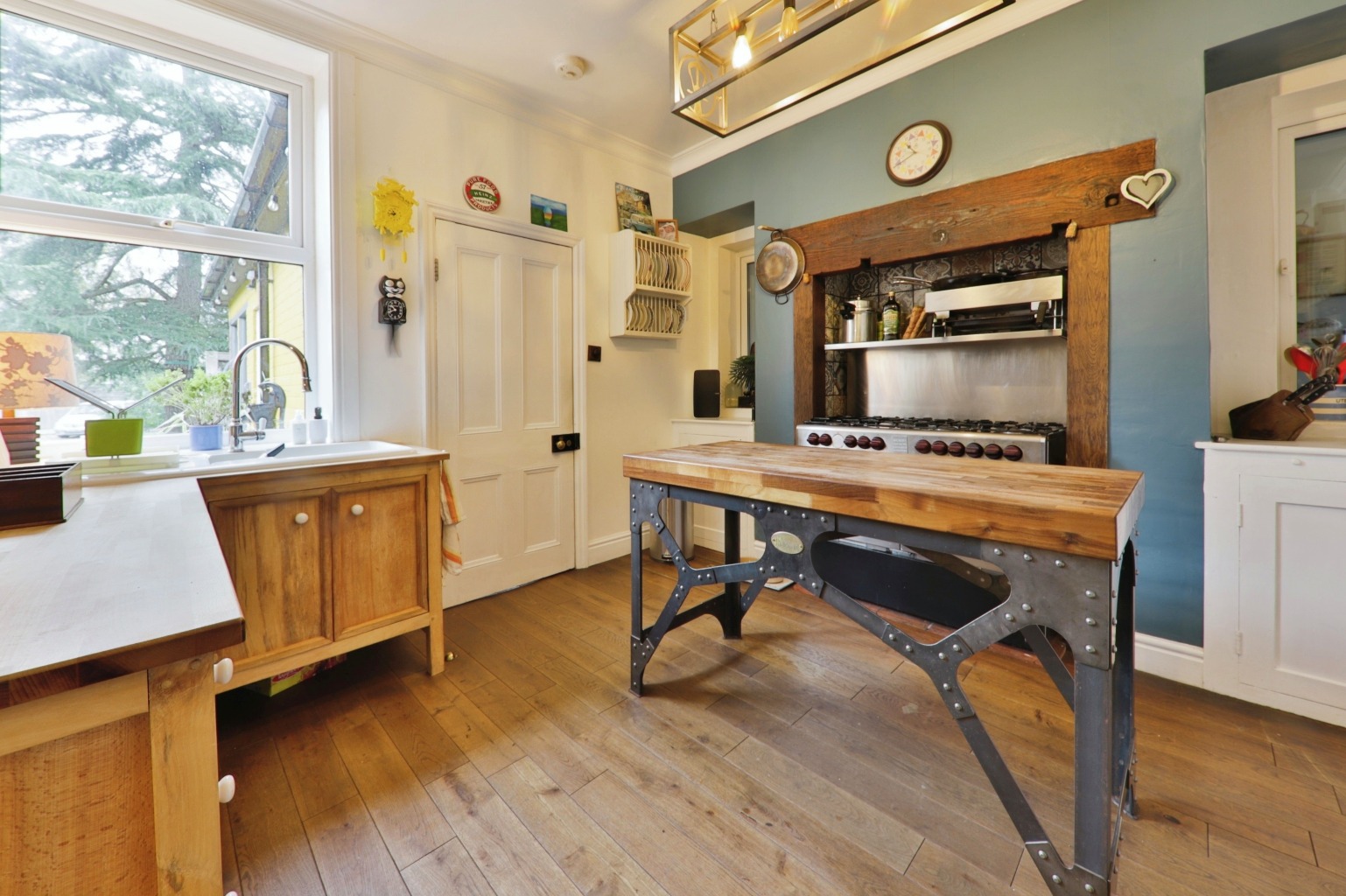 With large walk-in pantry. A chimney breast feature houses a range oven. There is a single drainer sink unit and a range of cabinets.