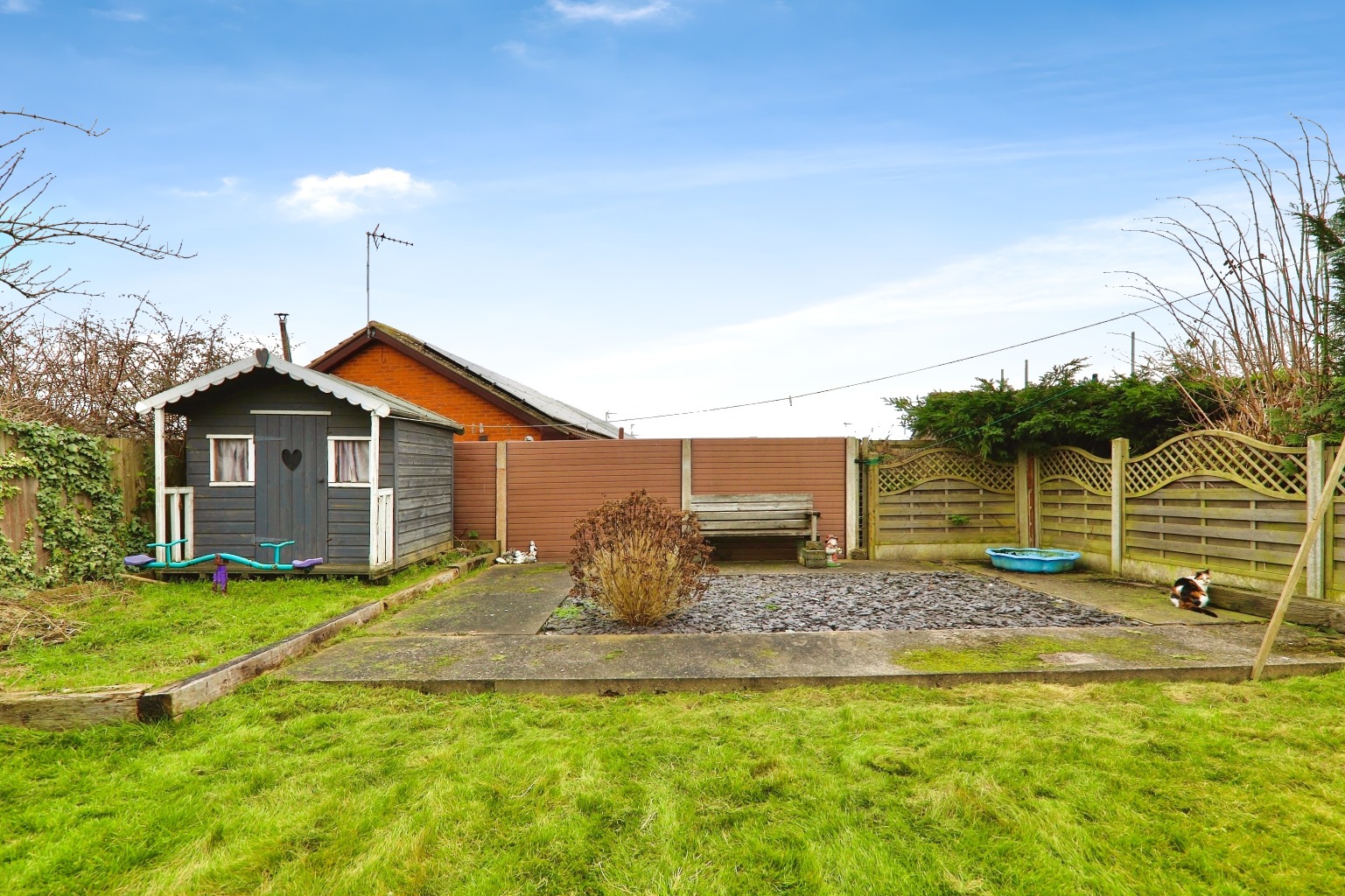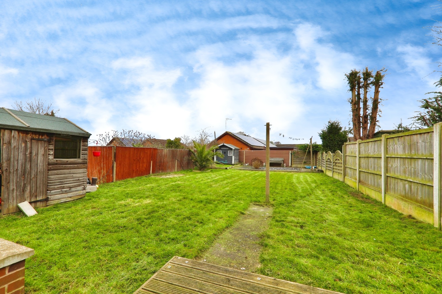 Upstairs, there are three bedrooms—two doubles and a single. The bathroom is neatly finished and serves the family well. But what really makes this home stand out is the outside space. The rear garden is much larger than usual, giving kids and pets plenty of room to play. A side drive provides off-road parking, and the garage is handy for storage.